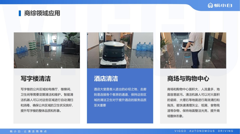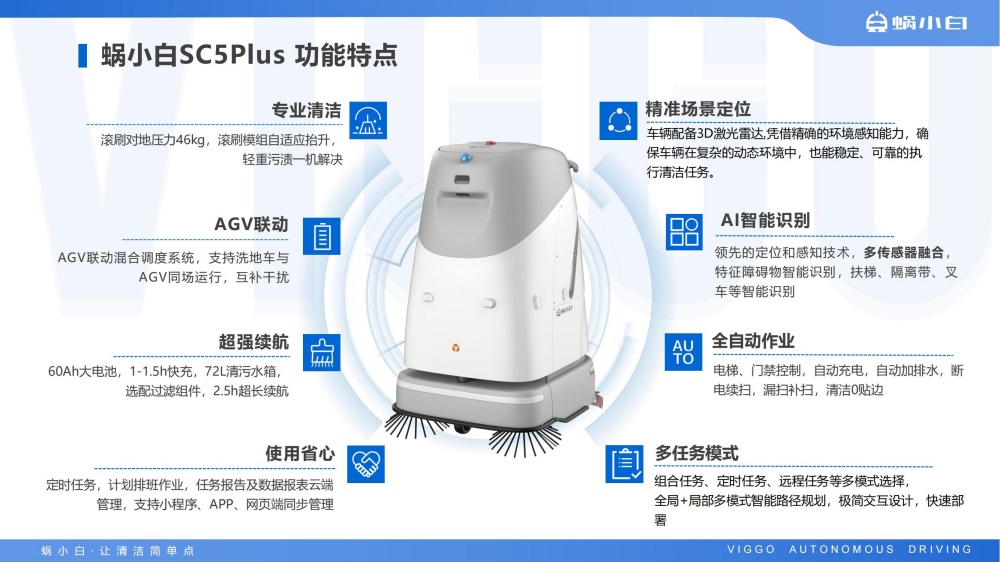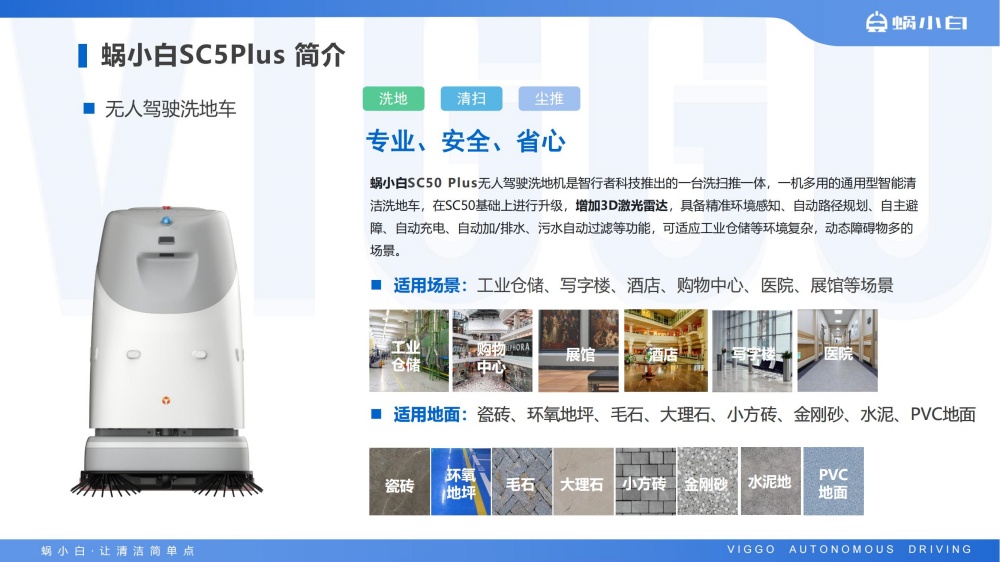 蜗小白SC50无人驾驶洗地机是智行者科技推出的一台洗扫推一体,一机多用的通用型智能清洁洗地车,具备精准环境感知、自动路径规划、自主避障、自动充电、自动加/排水、污水自动过滤等功能,可轻松应对水泥、大理石、PVC等各种室内中小型场景硬地面。